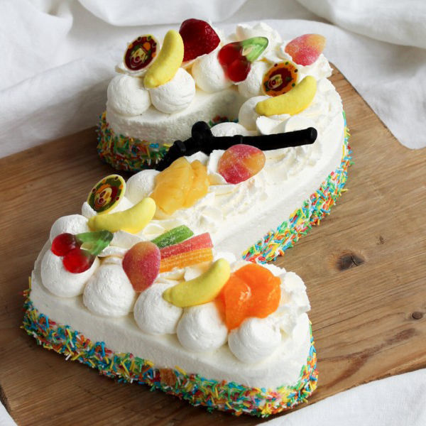 8 tot 10 personen / Taart in cijfer 2 van cake, slagroom en abrikozenjam. Afgemaakt met slagroom, gekleurde hagel, kinderversiering en vers fruit (zorg dat er bij de betreffende bezorgdag iemand thuis aanwezig is om uw bestelling in ontvangst te nemen)