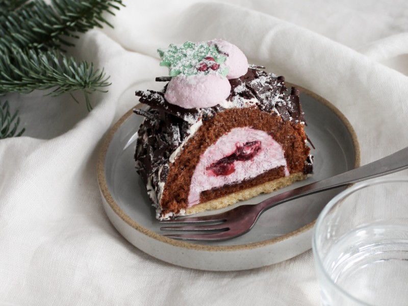 Chocoladecake met kersen bavarois en kersen vulling