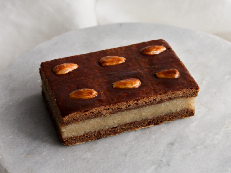 Tussen twee lagen speculaasdeeg gebakken amandelspijs, afgemaakt met amandelen