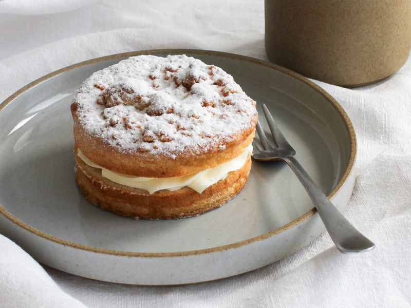 Zoet broodje gevuld met banketbakkersroom, afgemaakt met een kruimel laag